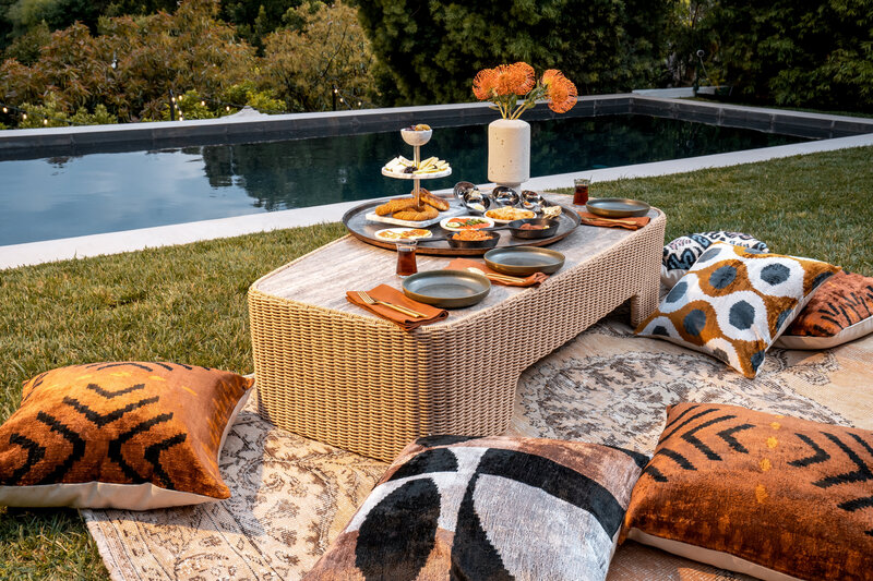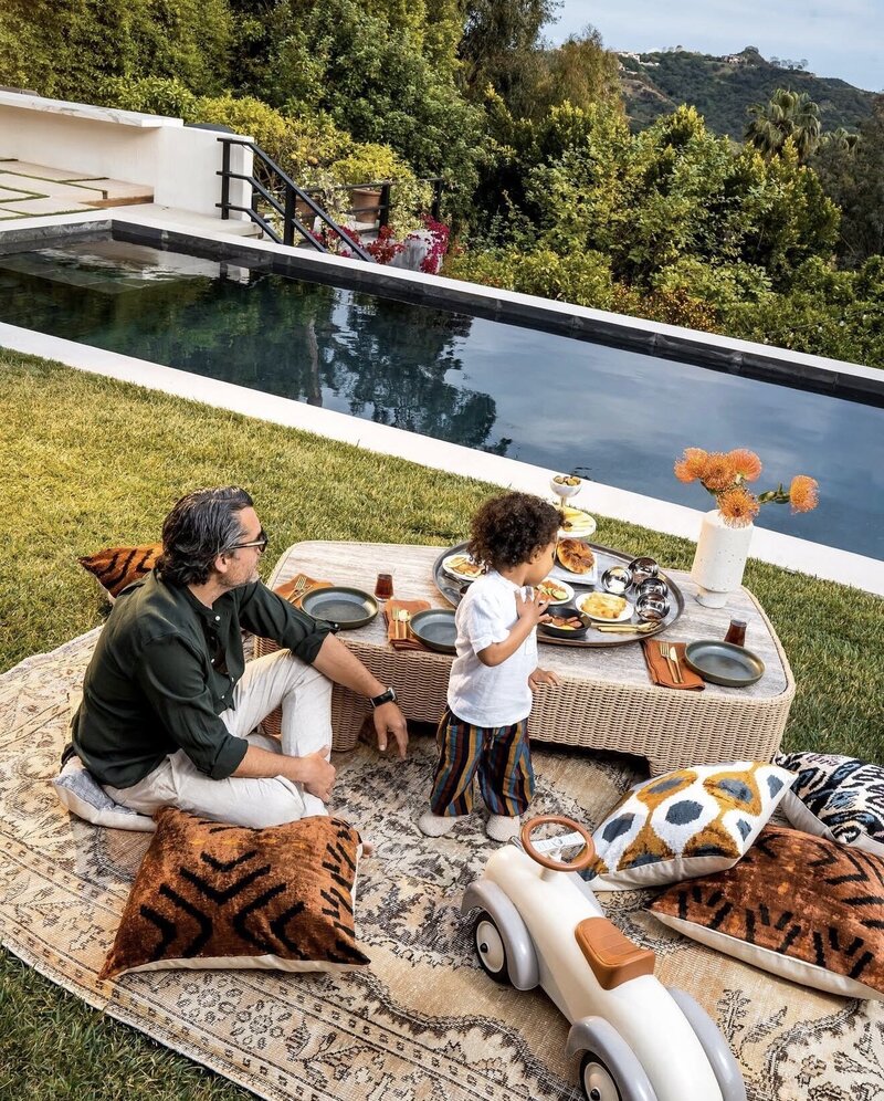 The focus was her backyard, a sunny corner of the property where she lounges, hosts, and dreams up creative ideas. The CB2 pieces blended into her world with a sleek, sculptural feel, so the images highlight her personal style without losing the modern elegance of the collection.